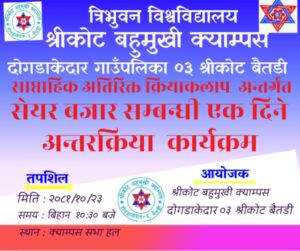 बैतडी -बैतडीको दोगडाकेदार गाउँपालिकामामा रहेको एक मात्र क्याम्पस श्रीकोट बहुमुखी क्याम्पस खोचलेक बैतडीमा एक दिने अन्तरक्रिया कार्यक्रम सम्पन्न भएको छ। साप्ताहिक अतिरिक्त कृयाकलाप अन्तर्गत सेयर बजार सम्बन्धि एक दिने अन्तरक्रिया कार्यक्रम सम्पन्न भएको बिद्यार्थी गुणस्तर समूह समिती अध्यक्ष नारायण प्रसाद अवस्थीले बताए। श्रीकोट बहुमुखी क्याम्पसको सभाहलमा सम्पन्न कार्यक्रममा बिधार्थी, शिक्षक लगायतको सहभागिता रहेको थियो।