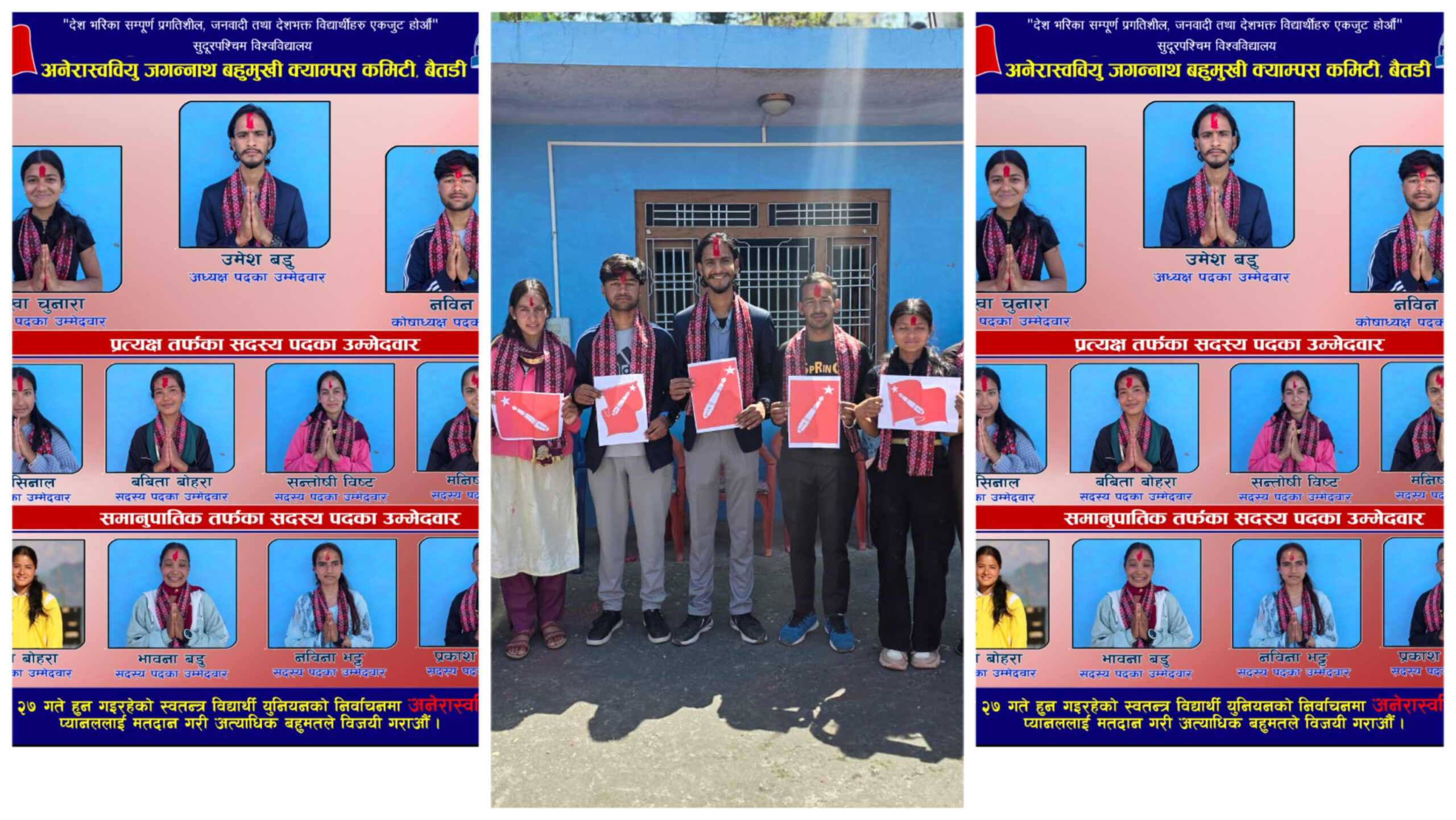 बैतडी -चैत्र २७ गते हुन गइरहेको स्वबियु निर्वाचनमा सुदुरपश्चिम विश्वविद्यालयको आङ्गिक क्याम्पस जगन्नाथ बहुमुखी क्याम्पस गोठालापानी बैतडीमा अनेरास्ववियुले बलियो टिम खडा गरेको छ। बलियो टिम सहित चुनावी मैदानमा उत्रिएको अनेरास्ववियु १७ वर्ष पछि आफ्नो इतिहास फर्काउने दाउमा रहेको छ।