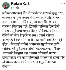 बैतडी -बैतडीको दोगडाकेदार गाउँपालिकाले जेष्ठ नागरिकहरुको समस्यालाइ मध्यनजर गर्दै बिगत ३ बर्षदेखि सामाजिक सुरक्षा भत्ता घरमै गइ वितरण गर्ने निर्णय गर्दापनि ग्लोबल आइएमइ बैंक दोगडाकेदार शाखाले अटेरी गर्दै गाँउपालिकाको निर्णय लत्याएको छ।