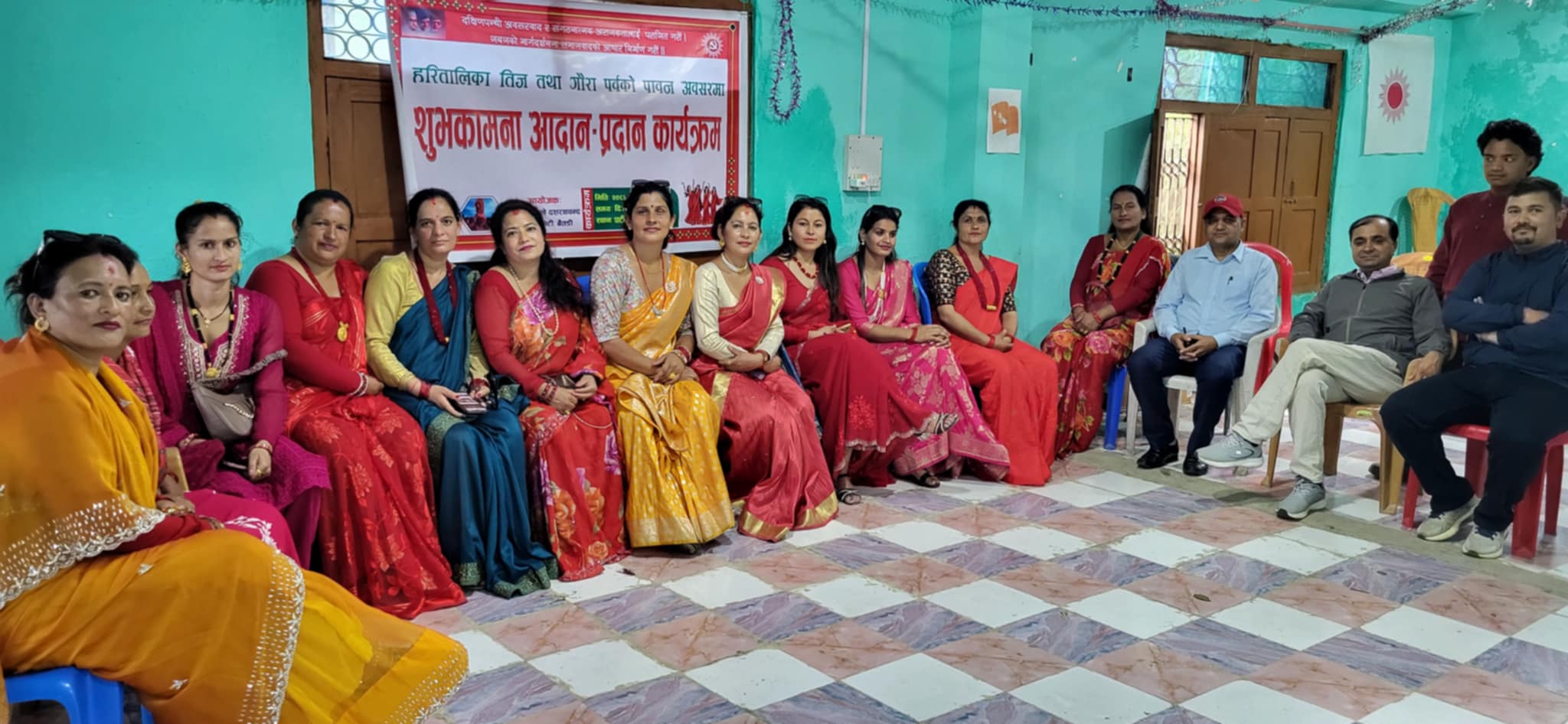 बैतडी:नेपाल कम्यूनिष्ट पार्टी एमाले दशरथचन्द नगर कमिटीको आयोजनामा हरितालिका तीज तथा गौरा पर्वको अवसरमा शुभकामना आदानप्रदान कार्यक्रम सम्पन्न भएको छ। दशरथचन्द नगरपालिकाका कमिटी अध्यक्ष मनोज बोहराको अध्यक्षतामा सम्पन्न शुभकामना आदानप्रदान कार्यक्रममा नेकपा एमाले केन्द्रीय कमिटी सदस्य एवं बैतडी जिल्ला इन्चार्ज लिलाधर भट्ट प्रमुख अतिथी रहेका थिए। यस्तै विशिष्ट अतिथिमा नेकपा एमाले प्रदेश कमिटी सदस्य बिस्ना चन्द, नेपाली कांग्रेस महासमिति सदस्य एवं महिला संघ बैतडी अध्यक्ष तुलसी ठगुन्ना लगायतको उपस्थिति रहेको थियो।