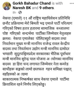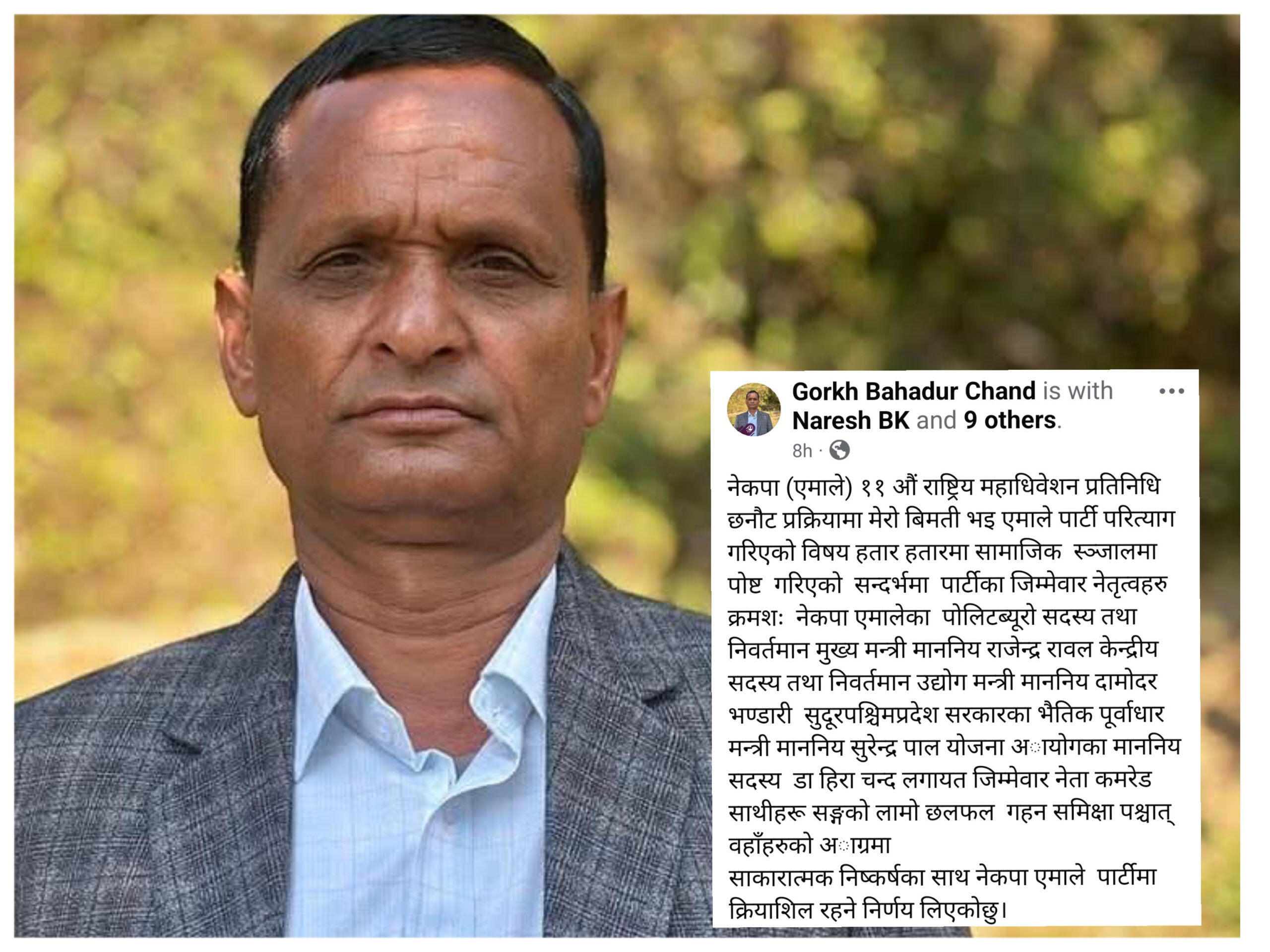 नेकपा (एमाले)को ११ औं राष्ट्रिय महाधिवेशन प्रतिनिधि छनौट प्रक्रियामा बिमती जनाएका एमाले प्रदेश कमिटी सदस्य एवं पञ्चेश्वर गाँउपालिका अध्यक्ष गोरख बहादुर चन्दले केहि दिन अगाडी सामाजिक सञ्जाल मार्फत एमाले पार्टी परित्यागको घोषणा गरेका थिए।
