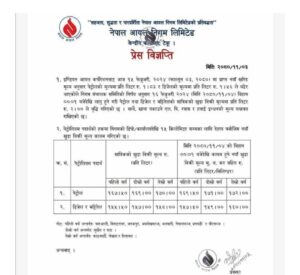 निमगका अनुसार खाना पकाउने ग्यास र हवाइ इन्धनको मूल्य भने यथावत राखिएको छ । निगमले भारतीय आयल कर्पोरेसन (आइओसी) ले पठाएको मूल्यसूची अनुसार नयाँ मूल्य तोकेको हो। आइओसीले पेट्रोलमा प्रतिलिटर १ रूपैयाँ ८३ पैसा र डिजेलमा एक रूपैयाँ ५६ पैसा बढाएर नयाँ मूल्य सूची पठाएको निगमद्वारा जारी विज्ञप्तिमा जनाइएको छ।