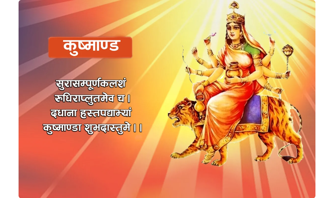श्री दुर्गा सप्तशती (चण्डी)को देवी कवचमा भनिएको छ, ‘कुत्सितः ऊष्मा कुष्मा–त्रिविधतापयुतः संसारः, स अण्डे मांसपेश्यामुदररुपायां यस्याः सा कूष्माण्डा’ अर्थात् त्रिविध तापयुक्त संसार जसको पेटमा छ, त्यही भगवती कूष्माण्डाका रूपमा चिनिन्छिन् ।